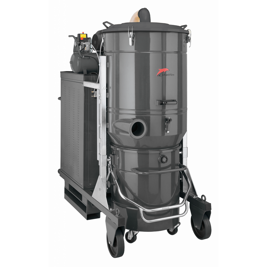 Il materiale aspirato si deposita nel contenitore carrellato, che ha una capacità di 220 lt., montato su ruote e provvisto di un pratico sistema di sgancio rapido. Per facilitare lo smaltimento di materiale pesante, il contenitore è predisposto per il sollevamento tramite carrello elevatore, grazie a una staffa di sollevamento (optional) Il bocchettone di entrata è tangenziale con diametro di 120 mm., e permette di aspirare nello stesso tempo polveri, solidi e liquidi contemporaneamente, senza nessun ulteriore accorgimento o modifica.